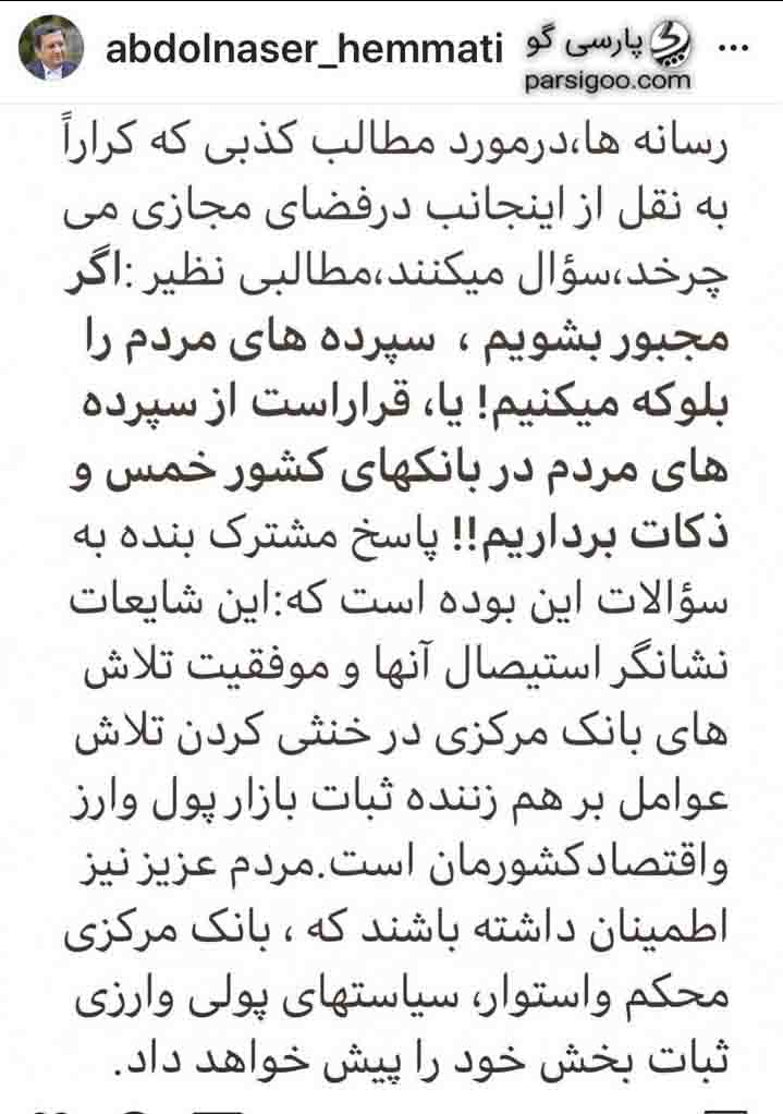 رییس کل بانک مرکزی نسبت به انتشار برخی شایعات در فضای مجازی واکنش نشان داد. به نوشته اقتصادآنلاین، عبدالناصر همتی در یک پست اینستاگرامی نوشت: «رسانه‌ها در مورد مطالب کذبی که کرارا به نقل از اینجانب در فضای مجازی می‌چرخد، سوال می‌کنند، مطالبی نظیر اگر مجبور بشویم، سپرده‌های مردم را بلوکه می‌کنیم، یا، قرار است از سپرده‌های مردم در بانک‌های کشور خمس و زکات برداریم. پاسخ مشترک بنده به این سوالات این بوده که این شایعات نشانگر استیصال آنها و موفقیت تلاش‌های بانک مرکزی در خنثی کردن تلاش عوامل برهم زننده ثبات بازار پول و ارز در اقتصاد کشورمان است. مردم عزیز نیز اطمینان داشته باشند که بانک مرکزی محکم و استوار سیاست‌های پولی و ارزی ثبات‌بخش خود را پیش خواهد برد.»