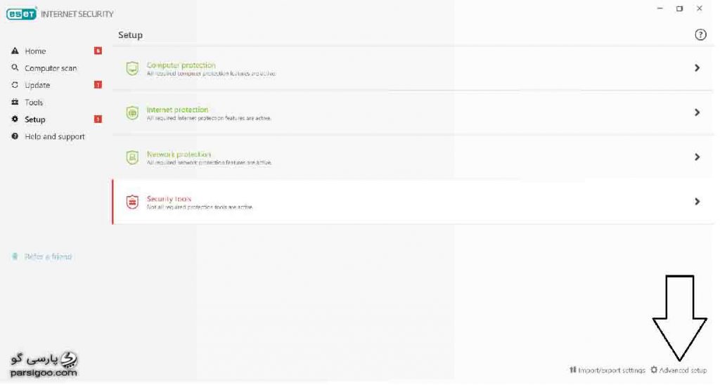 برای اعتماد سازی پوشه بازی در آنتی ویروس ابتدا از صفحه اصلی آنتی ویروس وارد بخش setup شوید. پس از آن مطابق تصویر گزینه advanced setup را انتخاب کنید.