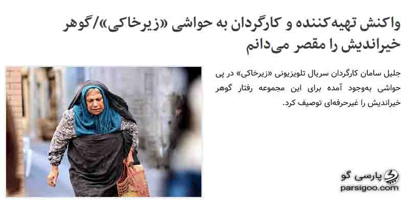 جلیل سامان کارگردان سریال تلویزیونی «زیرخاکی» در پی حواشی بهوجود آمده برای این مجموعه رفتار گوهر خیراندیش را غیرحرفهای توصیف کرد. به نوشته خبرآنلاین، جلیل سامان کارگردان سریال «زیرخاکی» در پی حاشیه هایی که برای پخش این سریال در شب های ماه مبارک رمضان به وجود آمده گفت: من خیلی دوست داشتم برای ۴۰ سالگی انقلاب کاری انجام دهم و کاری را به پخش برسانم. سعی داشتم در فضایی با نشاط و با یک نگاه متفاوت به ماجرای انقلاب و تاریخ انقلاب نگاه کنم.