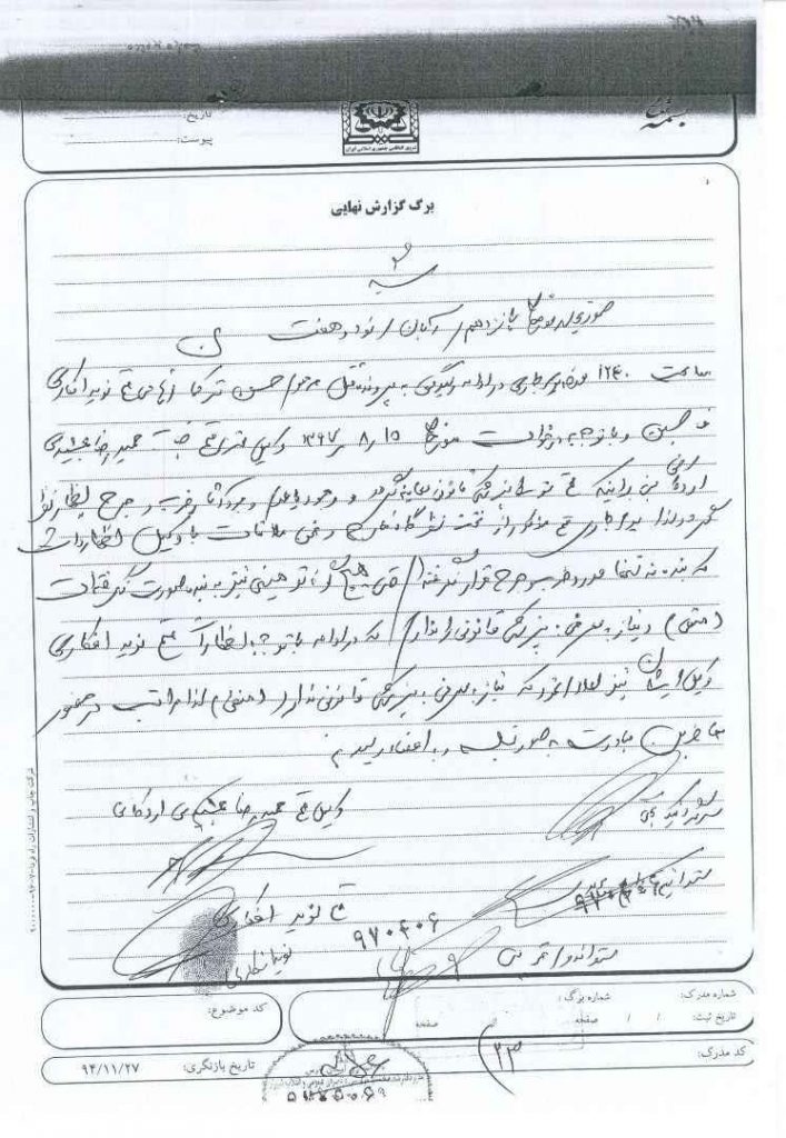 این صورتجلسه به امضا و اثر انگشت نوید افکاری و وکیلی تعیینی وی و همچنین مسئولان رسیدگی به پرونده در نیروی انتظامی رسیده است.