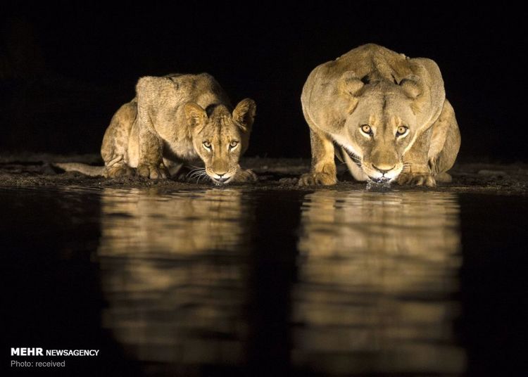 تصاویر آب خوردن شیرهای وحشی در شب