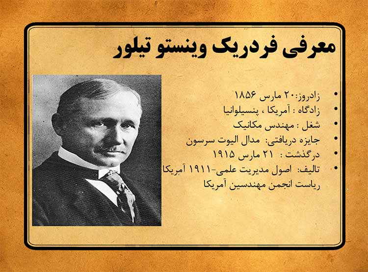 مجله اینترنتی پارسی گو: فردریک وینسلو تیلور (Ferdrick Winslow Taylor) متولد ۱۸۵۶ در فیلادلفیا آمریکا است. وی در امتحان ورودی وکالت دانشگاه هاروارد پذیرفته شد ولی ترجیح داد وارد صنعت شود.