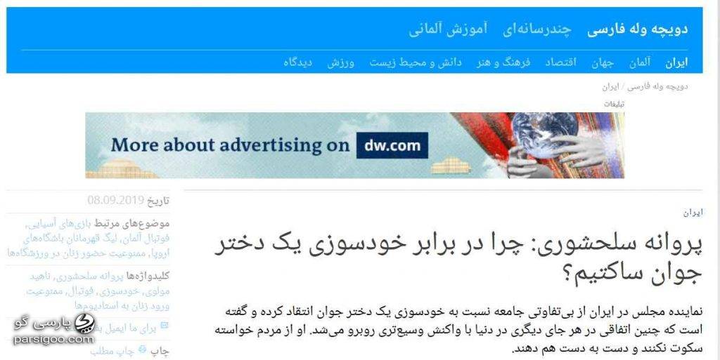 انعکاس موضع پروانه سلحشوری درباره دختر آبی در دویچه وله