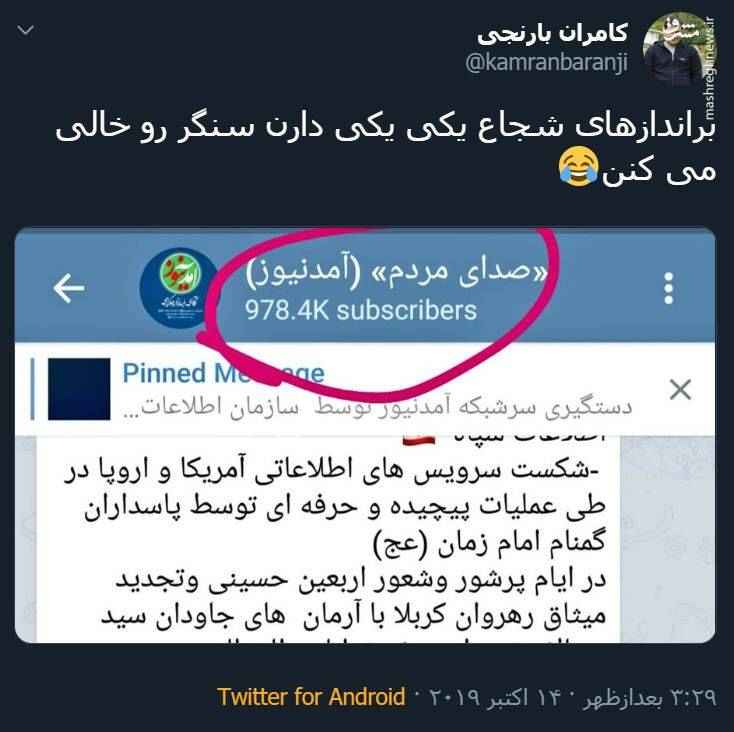 کاربر دیگری به نام رفیق نوشت: «آقایون و خانوما برید کانال آمدنیوز لذتشو ببرید افتاده دست بچههای سپاه». کاربر دیگری نوشت: «دشمنی دشمن که مشخص بود اما فریبخوردههایی که گول اینها را خوردند باید بدانند نتیجه بازی در پازل دشمن چیزی جز رسوایی نیست!»